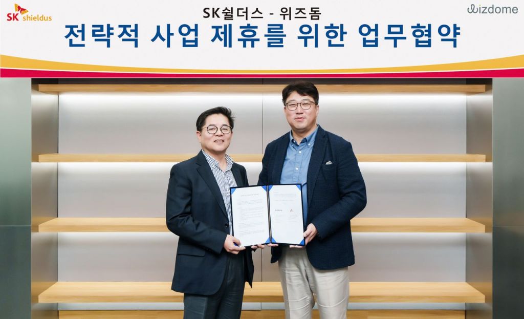 김영주 SK쉴더스 융합보안사업부 부사장(왼쪽)과 한상우 위즈돔 대표가 기념 촬영을 하고 있다. SK쉴더스 제공