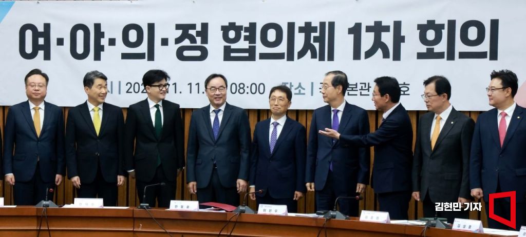 한동훈 국민의힘 대표와 한덕수 국무총리, 이진우 대한의학회장 등이 11일 국회에서 열린 ‘여야의정 협의체‘ 1차 회의에서 기념촬영을 하고 있다.