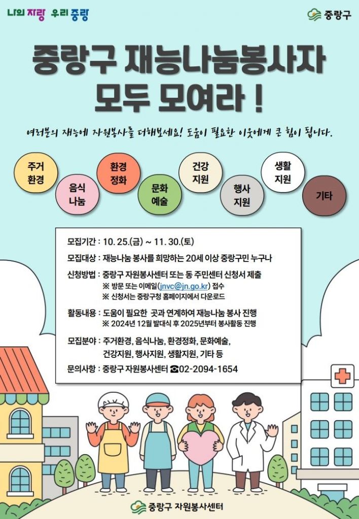 모집 분야는 ▲이·미용 ▲집수리 ▲밑반찬 나눔 및 배달 ▲생활지원 ▲의료봉사 ▲문화예술 등이며, 소외된 이웃의 일상을 돕기 위해 자신의 경험과 재능을 나누려는 20대 이상의 중랑구민이라면 누구나 참여가 가능하다.