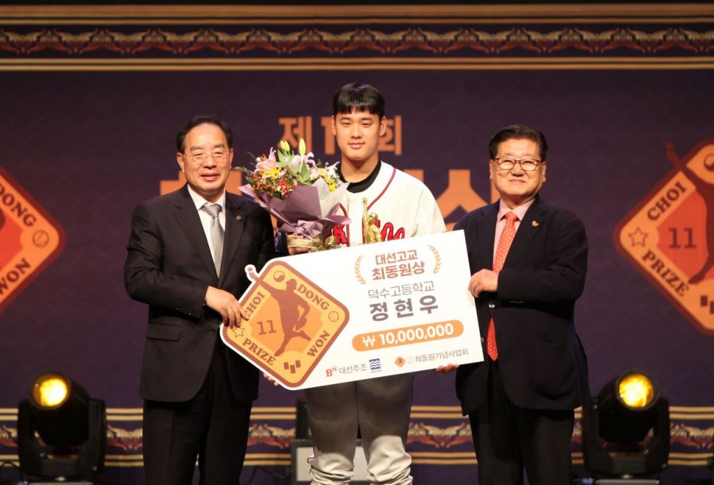 대선주조는 11일 오후 2시 부산은행 본점 강당에서 열린 제11회 최동원상 시상식에서 ‘제7회 대선 고교 최동원상’ 수상자 정현우와 소속 학교 덕수고 야구부에 총상금 1000만원을 전달했다고 전했다.