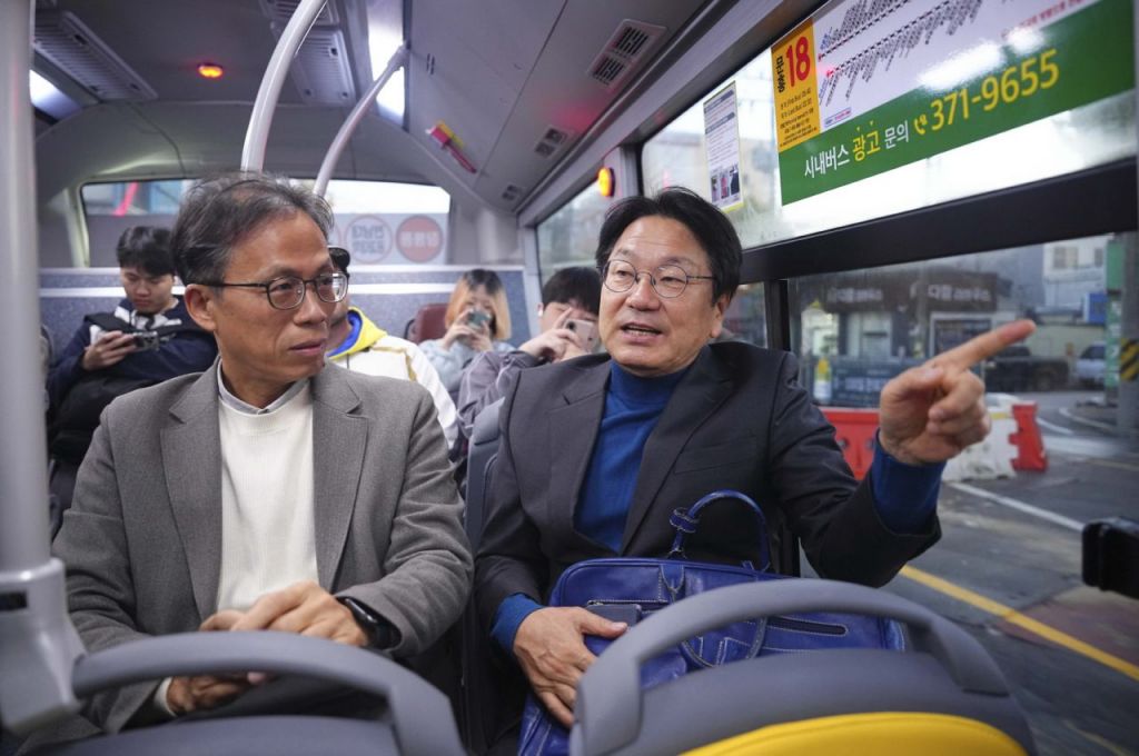 강기정 광주시장이 ‘대자보 도시 광주’ 실현을 위해 11일 오전 북구 문흥동 자택에서 시청까지 버스를 타고 출근하며 시민과 대화하고 있다. 광주시 제공