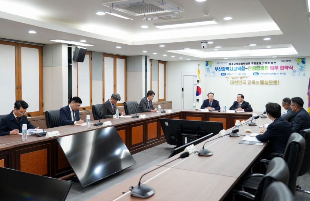 하윤수 부산시 교육감이 11일 오후 4시 30분 시 교육청 제1 회의실에서 정근 온종합병원 그룹원장 등 업무 관계자들이 참석한 가운데 특수교육대상학생 행동중재 지원을 위한 업무협약을 체결했다.