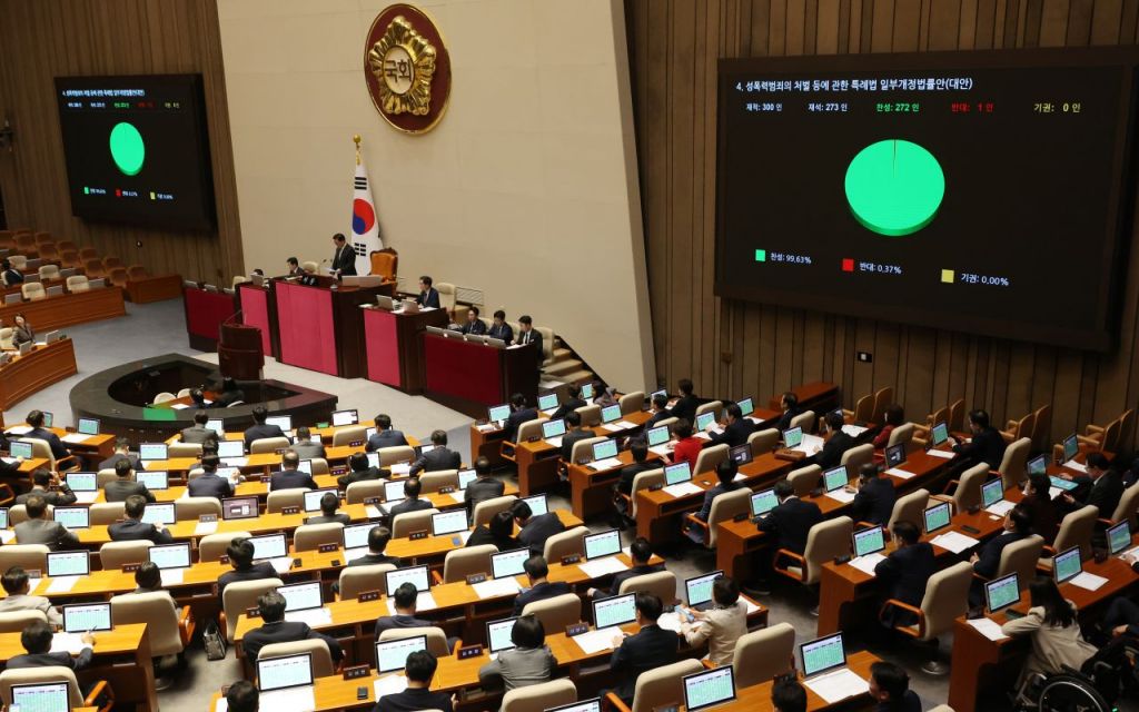 국회는 14일 오후 본회의를 열고 성폭력 범죄의 처벌 등에 관한 특례법 일부개정법률안(성폭력특별법 개정안)을 재적 의원 273명 중 찬성 272표, 반대 1표로 가결했다. 이준석 개혁신당 의원이 반대표를 던졌다.