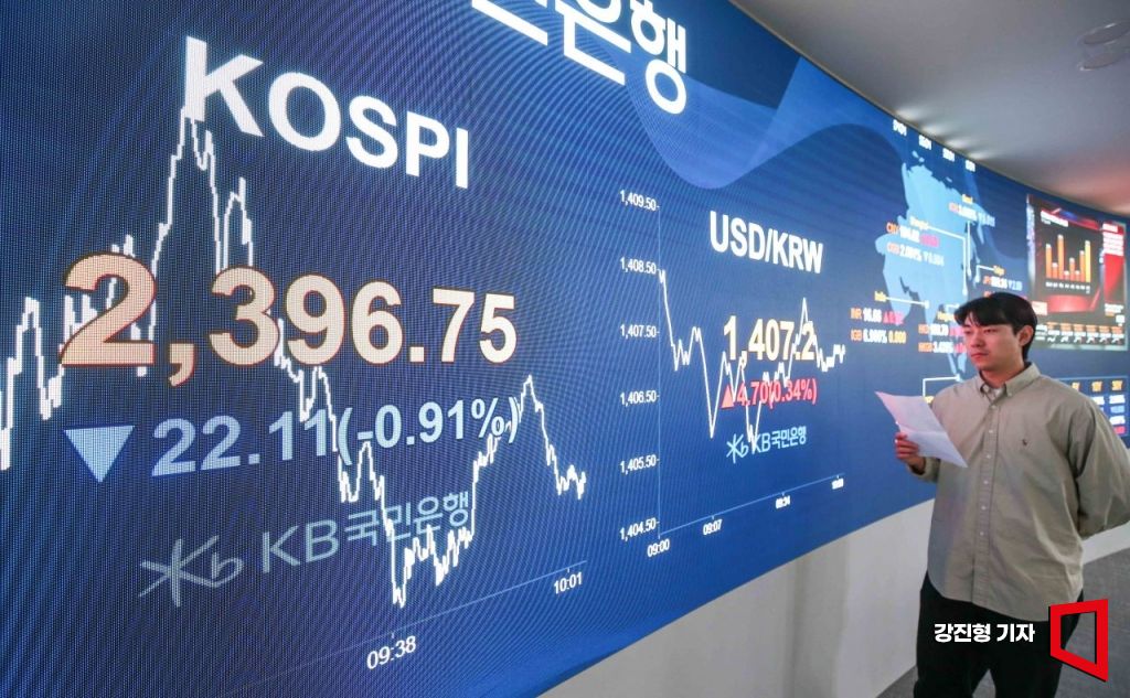 코스피 지수가 지난 8월 '블랙먼데이' 이후 3개월 만에 2400선을 하회한 15일 서울 여의도 KB국민은행 딜링룸에서 딜러들이 업무를 보고 있다. 이날 원달러 환율은 전일 대비 2.9원 오른 1408원에 개장했다.