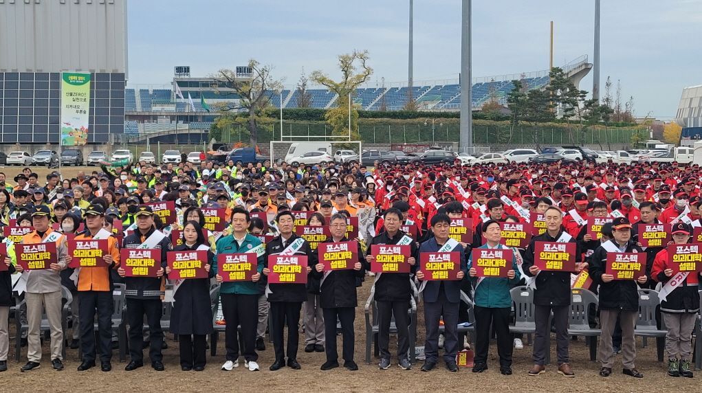 포항시가 15일 가을철 산불 조심 기간을 맞아 포항야구장 뒤편 잔디광장에서 ‘산불예방 발대식·범시민 결의대회’를 개최했다. 포항시 제공