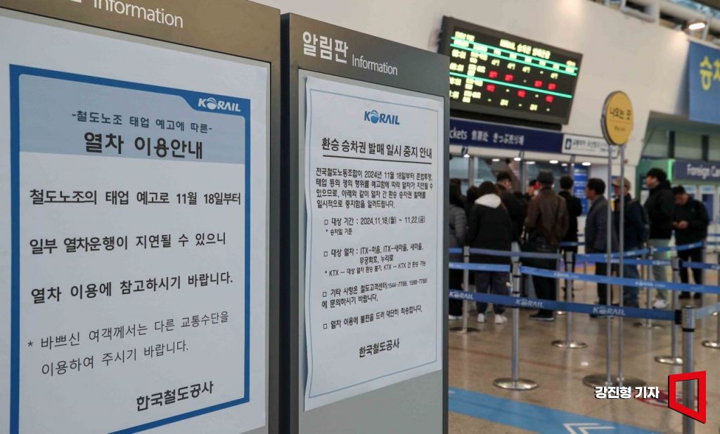 민주노총 공공운수노조 전국철도노동조합이 준법투쟁(태업)에 돌입한 18일 서울역 대합실에 태업 관련 안내문이 붙어 있다.