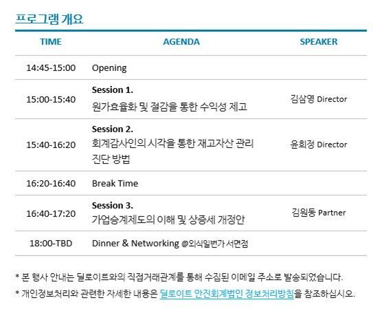 세미나는 총 세 개의 세션으로 구성된다. 첫 번째 세션에서는 김삼영 딜로이트 안진 이사가 '원가효율화 및 절감을 통한 수익성 제고'를 주제로 강연한다. 두 번째 세션에서는 윤희정 딜로이트 안진 이사가 '회계감사인의 시각을 통한 재고자산 관리 진단 방법'을 소개하며, 마지막 세션에서는 김원동 딜로이트 안진 파트너가 '가업승계제도의 이해 및 상속·증여세 개정안'에 대해 설명할 예정이다.