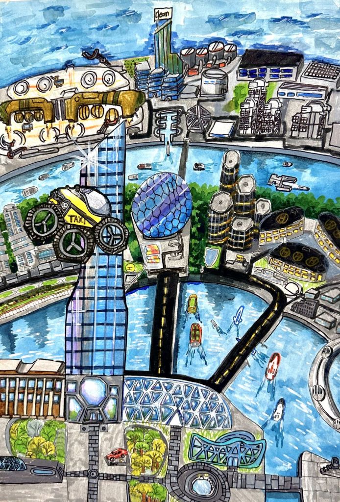 제8회 교육부 장관상 수상자 조강현 어린이의 ‘이-프리 플로팅 시티(E-free Floating City)’ 작품 이미지. 현대차 제공