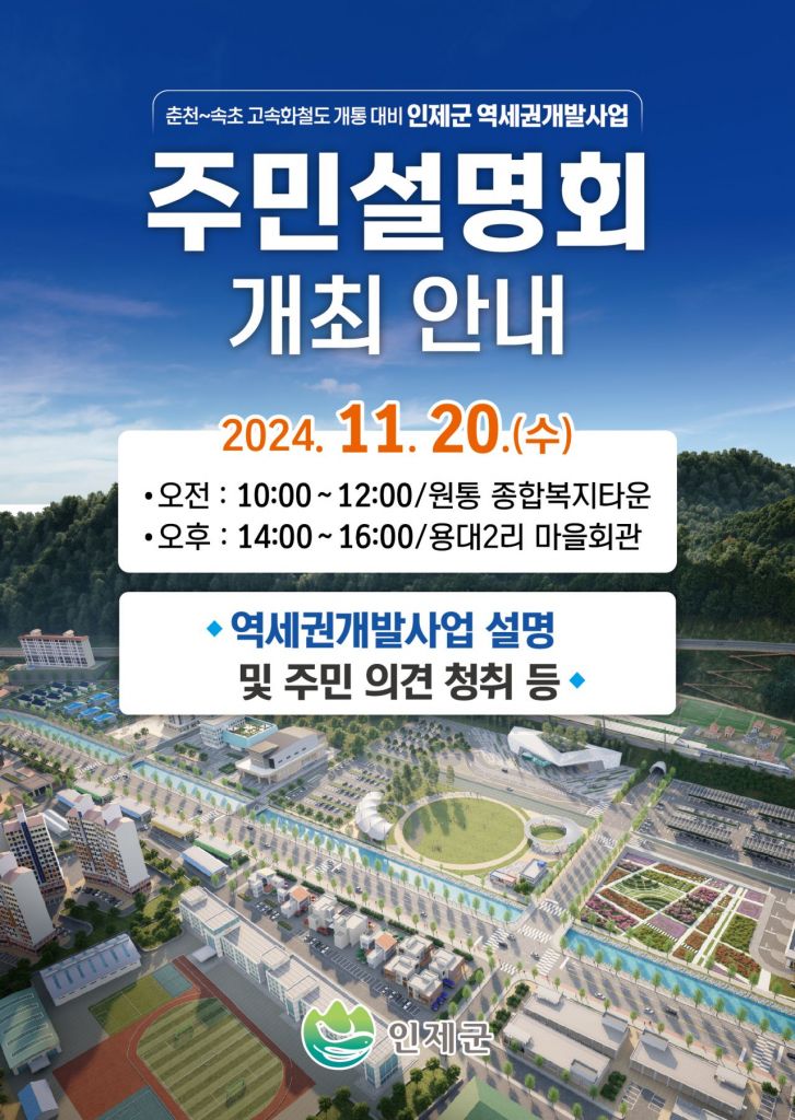 강원특별자치도 인제군(군수 최상기)은 18일, 2027년 동서고속화철도 춘천~속초 구간 개통에 대비해 역세권 개발사업 주민설명회를 20일에 개최한다고 밝혔다.