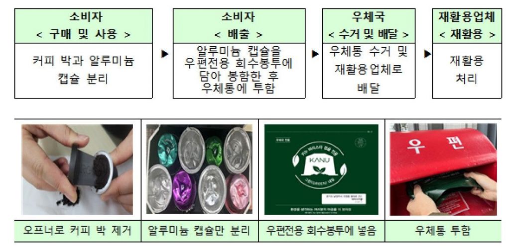 우체통에 투함한 알루미늄 캡슐을 집배원이 회수해 재활용업체로 배달하면, 업체는 회수된 알루미늄 캡슐을 재활용 소재로 활용하게 된다. 자칫 버려지기(폐기되기) 쉬운 알루미늄 커피캡슐을 재활용할 수 있는 토대가 마련된 셈이다.