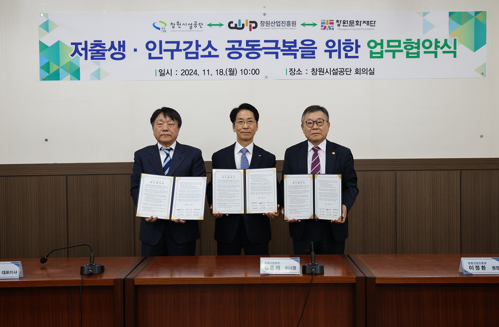 경남 창원특례시 산하기관인 창원시설공단과 창원문화재단, 창원산업진흥원 등 창원시 산하 3개 기관은 18일 창원시설공단 회의실에서 저출생 극복을 위한 업무협약을 체결했다.