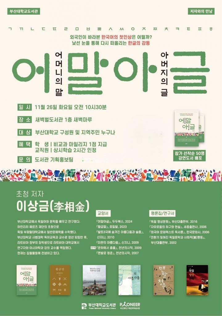 이번 강연은 교내 구성원뿐만 아니라 시민 누구나 부산대 도서관 홈페이지 공지사항에 게재된 접수 링크를 통한 사전 신청과 현장 참석이 가능하다. 사전 신청 참가자 50명에게는 저자 신간 ‘어말아글’ 도서 증정 이벤트가 진행된다.