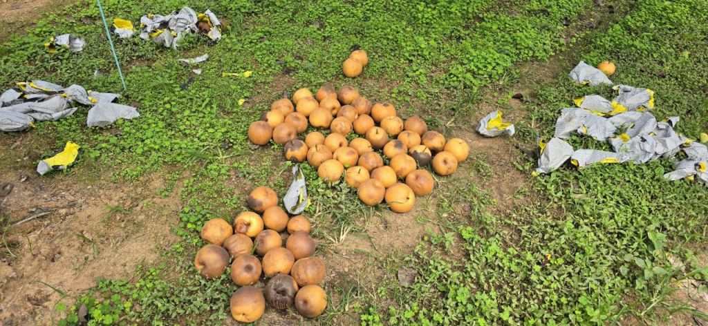 전남도는 지난 여름 폭염 현상으로 배 햇볕 뎀 피해(일소)를 농업재해로 인정해 줄 것을 정부에 지속적으로 건의했다. 사진은 전남 배 재배농가가 일소 피해로 낙과현상이 속출했댜. 전남도 제공