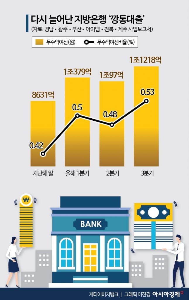 하지만 다른 지표를 보면 지방은행의 건전성이 나빠졌다는 걸 알 수 있다. 6개 지방은행의 올해 3분기 무수익여신은 약 1조1218억원이다. 무수익여신이 총여신에서 차지하는 비율은 0.53%다. 지난해 말 각각 8631억원·0.42%였던 무수익여신 잔액과 비율은 올해 1분기 1조379억원·0.5%로 증가했다가 2분기 1조97억원·0.48%까지 떨어졌으나 다시금 증가한 것이다. 1분기보다 잔액과 비율 모두 늘어났다.
