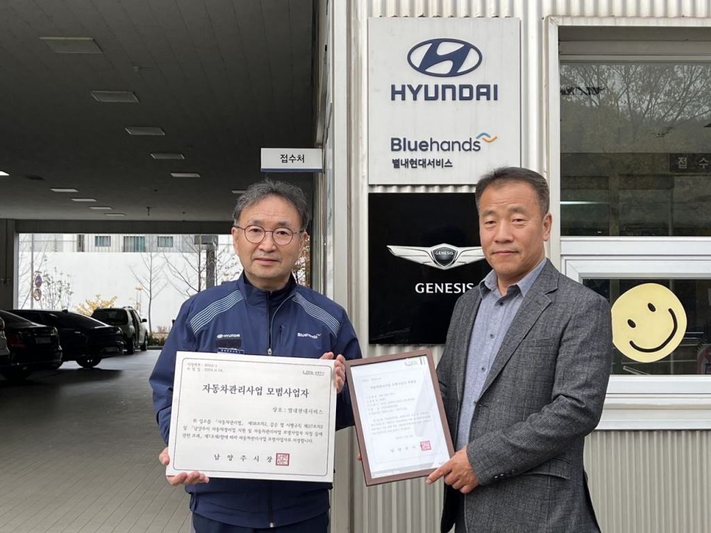 남양주시는 지난 15일 자동차관리사업 모범사업자로 지정된 별내현대서비스에 지정증 및 표지판을 전달하고 있다. 남양주시 제공
