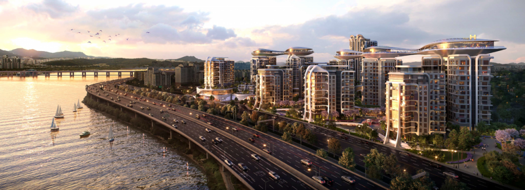 자하 하디드는 한강의 물결과 남산의 능선을 형상화한 곡선미를 구현하기 위해 기존의 직선형 설계를 과감히 탈피하고, 곡선형 알루미늄 패널 8만8000장을 제안했다. 당초 51개 동에서 22개를 줄인 29개 동으로 세대 간 간섭을 최소화하고, 45˚ 회전된 주동 배치로 전 세대가 한강, 남산, 용산공원 조망을 누릴 수 있도록 했다.