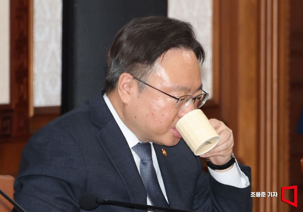 조규홍 보건복지부 장관이 19일 서울 종로 정부서울청사에서 열린 국무회의에 참석, 음료를 마시고 있다.