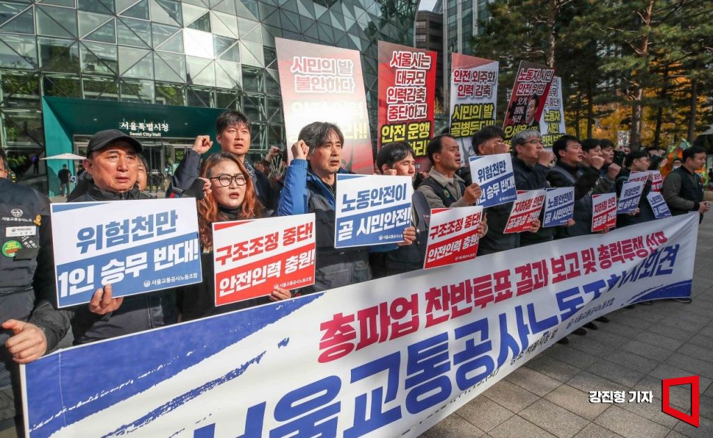 19일 서울 중구 서울시청 앞에서 서울교통공사노동조합 소속 조합원들이 파업 선포 기자회견을 열고 임금 인상 및 인력 충원을 촉구하고 있다.