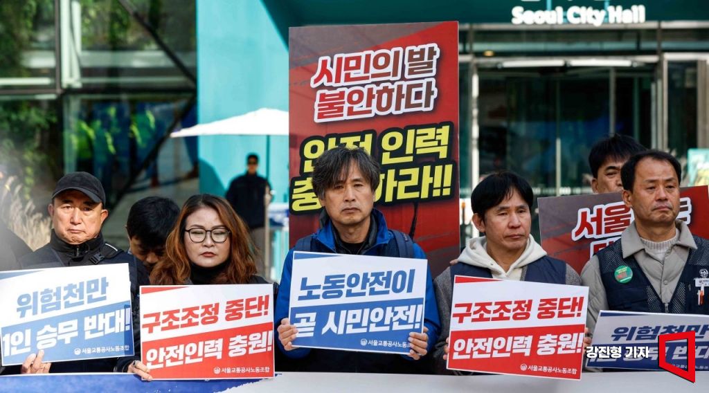 19일 서울 중구 서울시청 앞에서 서울교통공사노동조합 소속 조합원들이 파업 선포 기자회견을 열고 임금 인상 및 인력 충원을 촉구하고 있다.