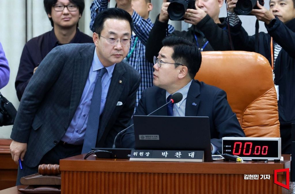 박찬대 국회 운영위원장이 19일 국회에서 운영위원회 전체회의에서 박성준 야당 간사와 대화하고 있다. 김현민 기자