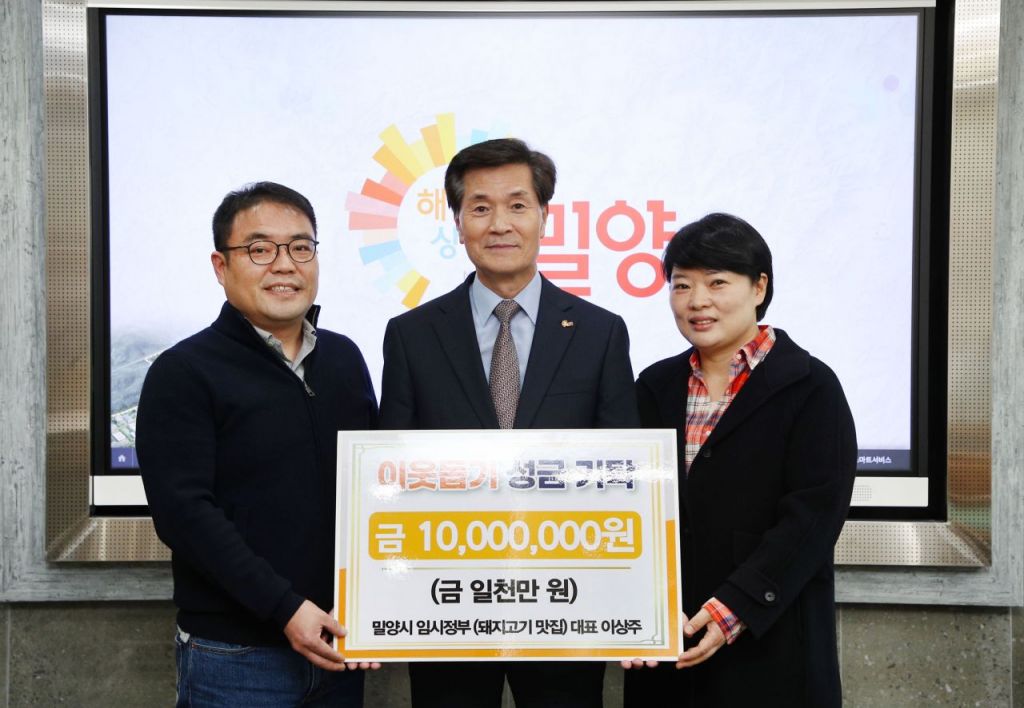 경남 밀양시는 지난 18일 고기 맛집으로 소문난 임시정부 이상주 대표가 밀양의 미래인 아이들을 위해 써달라며 성금 1000만원을 기탁했다고 19일 밝혔다.