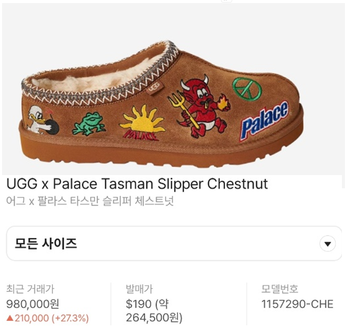 어그와 영국 스트리트 패션 브랜드 팔라스 스케이트보드가 협업해 지난해 말 출시한 '어그x팔라스 타스만 슬리퍼 체스트넛'의 발매가는 190달러(약 26만원)이다. 하지만 최근 거래가는 98만원을 기록했다. 번트 올리브 컬러 역시 거래가 85만원으로 출고가보다 3배 이상 비싸다.