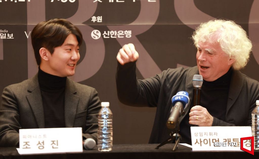 창단 75주년을 맞은 바이에른 방송교향악단이 이달 20일과 21일 서울 롯데콘서트홀에서 여는 조성진과의 협연 콘서트에 앞서 19일 서울 송파구 롯데콘서트홀 리허설룸에서 기자간담회를 열었다. 상임지휘자 사이먼 래틀 경이 기자의 질문에 답하면서 조성진의 연주에 대한 칭찬을 하자 조성진이 웃고 있다. 허영한 기자