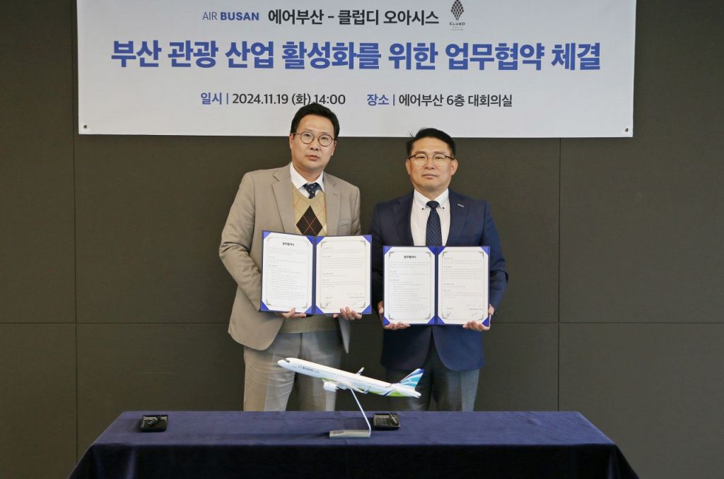에어부산(대표 두성국)은 지난 19일 에어부산 사옥에서 이도(대표 최정훈)가 운영하는 클럽디 오아시스와 업무협약을 체결했다.