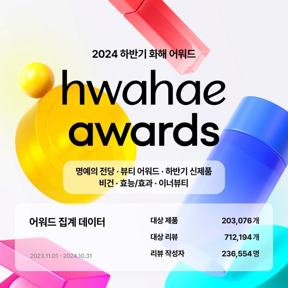 뷰티 플랫폼 화해를 운영하는 버드뷰는 20일 '2024 하반기 화해 어워드'를 개최하고 수상 제품을 발표했다. 화해 어워드는 36만 개의 제품, 880만 개의 사용자 리뷰 및 평점 등 대규모 데이터를 기반으로 진행되는 K뷰티 시상식이다. 연간 가장 주목받은 인기 제품을 선정하는 ▲뷰티 어워드 ▲명예의 전당을 비롯해 지난 5월부터 10월까지 집계된 리뷰를 기반으로 ▲베스트 신제품 ▲효능?효과 ▲이너뷰티 ▲비건 등 6개 부문에서 시상을 진행했으며 총 645개 제품이 수상했다.