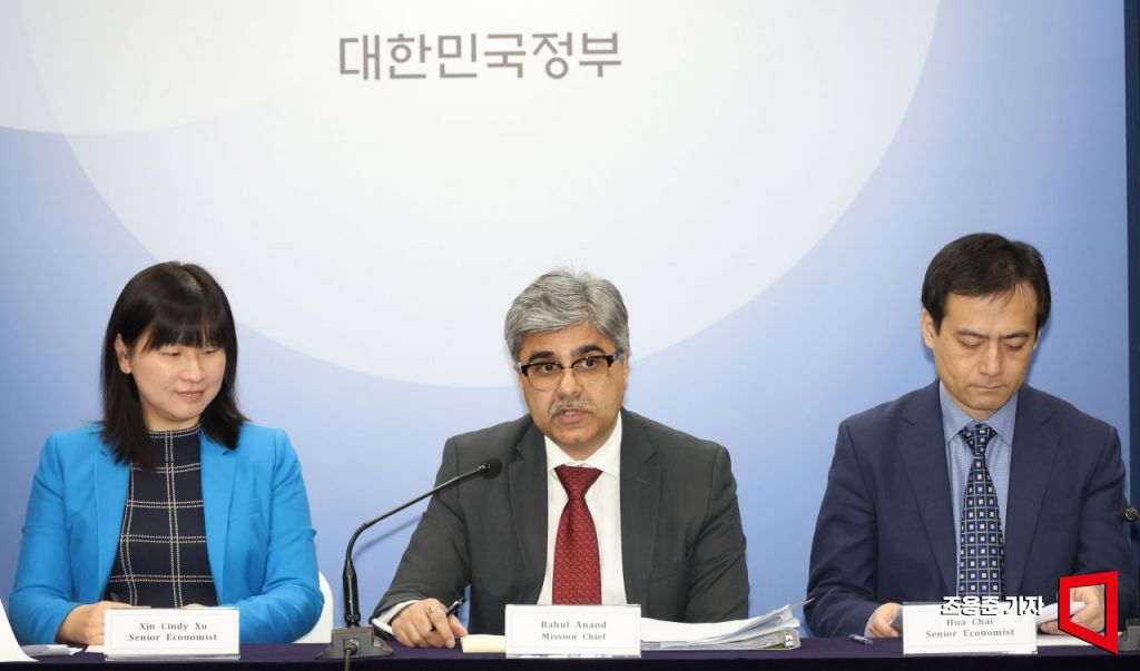 IMF 라훌 아난드 한국미션단장이 20일 서울 종로구 정부서울청사에서 IMF연례협의 결과를 발표하고 있다. 라훌 아난드 단장을 비롯해 IMF 협의단은 지난 7일부터 20일까지 한국을 방문, 연례협의를 진행했다.