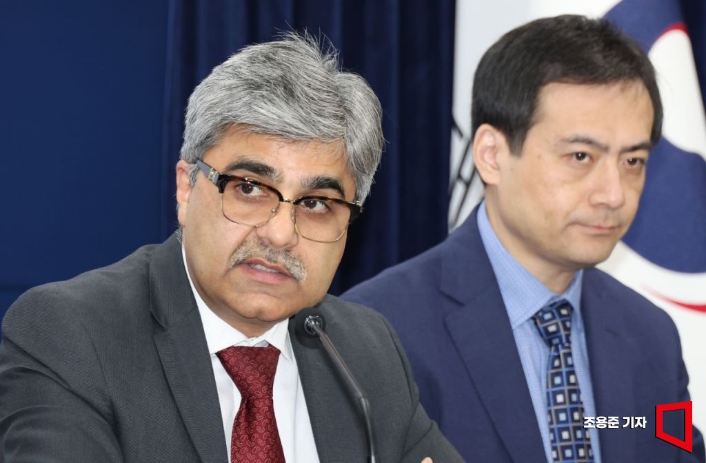 IMF 라훌 아난드 한국미션단장이 20일 서울 종로구 정부서울청사에서 IMF연례협의 결과를 발표하고 있다. 라훌 아난드 단장을 비롯해 IMF 협의단은 지난 7일부터 20일까지 한국을 방문, 연례협의를 진행했다.