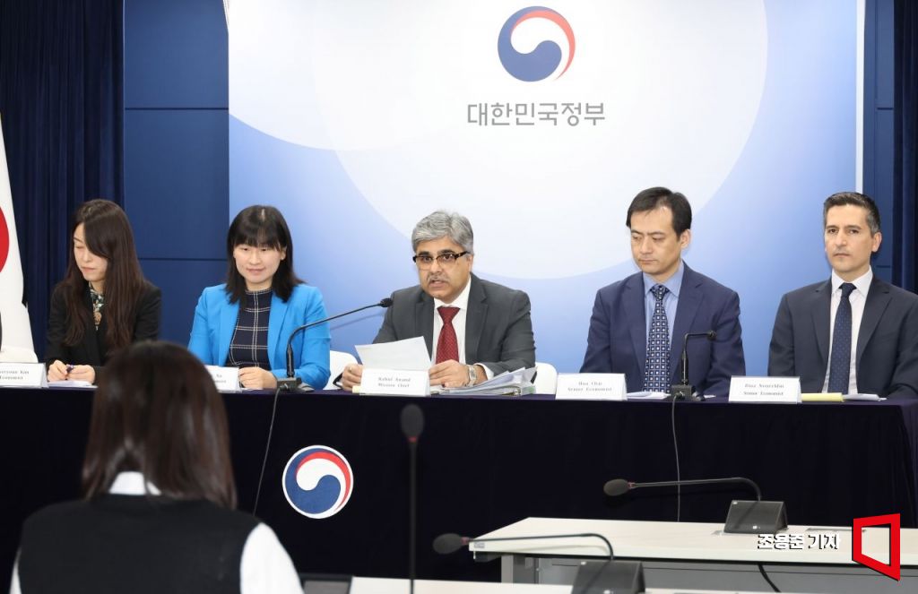 IMF 라훌 아난드 한국미션단장이 20일 서울 종로구 정부서울청사에서 IMF연례협의 결과를 발표하고 있다. 라훌 아난드 단장을 비롯해 IMF 협의단은 지난 7일부터 20일까지 한국을 방문, 연례협의를 진행했다.