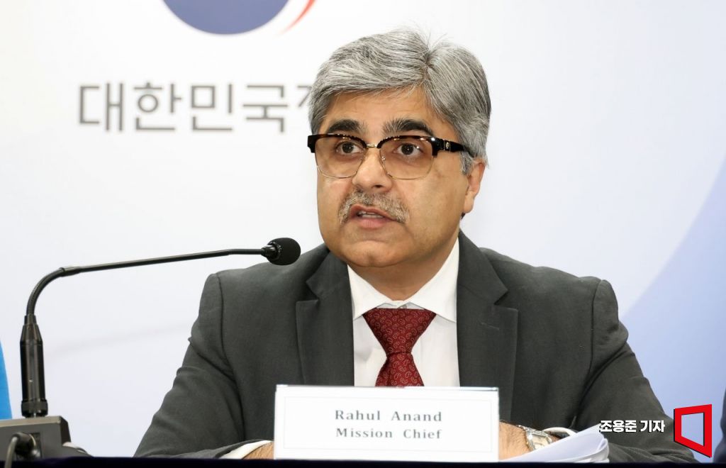 IMF 라훌 아난드 한국미션단장이 20일 서울 종로구 정부서울청사에서 IMF연례협의 결과를 발표하고 있다. 라훌 아난드 단장을 비롯해 IMF 협의단은 지난 7일부터 20일까지 한국을 방문, 연례협의를 진행했다.