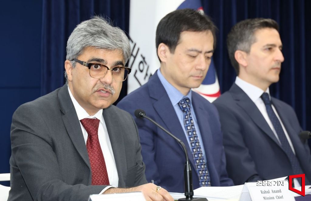 IMF 라훌 아난드 한국미션단장이 20일 서울 종로구 정부서울청사에서 IMF연례협의 결과를 발표하고 있다. 라훌 아난드 단장을 비롯해 IMF 협의단은 지난 7일부터 20일까지 한국을 방문, 연례협의를 진행했다.