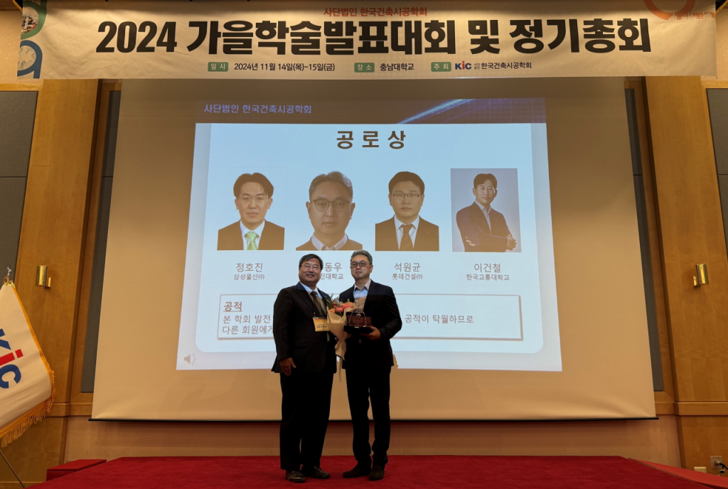 대진대학교 공과대학 건축공학부 류동우 교수가 지난 15일 ㈔한국건축시공학회에서 주최한 2024 가을학술발표대회에서 공로상을 수상하고 있다. 대진대학교 제공