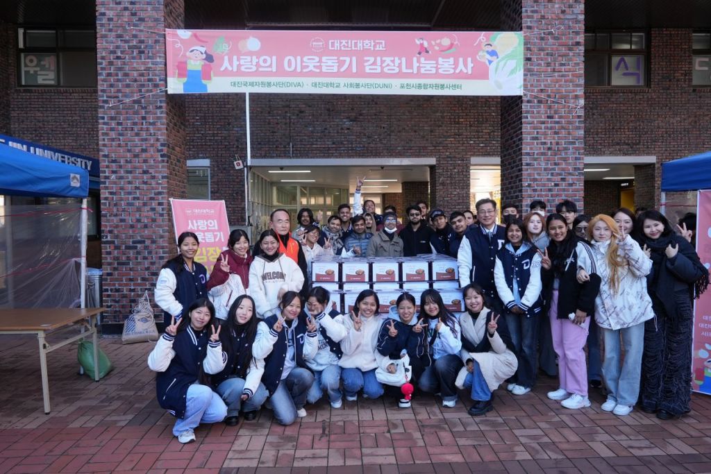대진대학교는 지난 18일 ㈔대진국제자원봉사단(DIVA)의 후원으로 대진대 학생회관 자주 광장에서 사랑의 이웃돕기 김장나눔 봉사를 실시한 후 기념촬영을 하고 있다. 대진대학교 제공