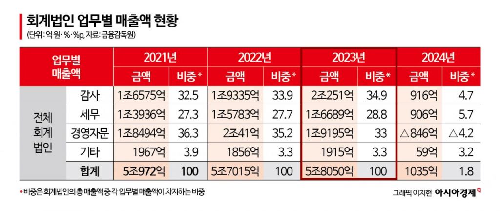 매출 증가율은 감사·세무·경영자문 등 전 부문에서 둔화한 가운데 경영자문 매출은 전기보다 4.2% 감소했다. 경영자문 매출이 줄어든 것은 경기둔화에 따른 시장 위축 때문이다. 반면 감사 부문 매출은 회계법인의 외부감사 대상 회사 증가 등으로 4.7% 늘었다. 세무부문도 경정 및 불복청구 관련 용역, 세무조정 업무 증가로 5.7% 늘었다.