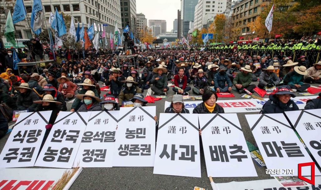 20일 서울 중구 숭례문 인근 세종대로에서 열린 '전국농민대회 및 윤석열 정권 퇴진 2차 총궐기'에서 민주노총 조합원 및 전국농민총연맹 소속 조합원들이 쌀 가격 안정 및 쌀 수입 반대 등을 촉구하고 있다.