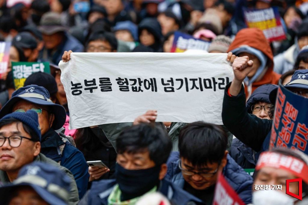 20일 서울 중구 숭례문 인근 세종대로에서 열린 '전국농민대회 및 윤석열 정권 퇴진 2차 총궐기'에서 민주노총 조합원 및 전국농민총연맹 소속 조합원들이 쌀 가격 안정 및 쌀 수입 반대 등을 촉구하고 있다.