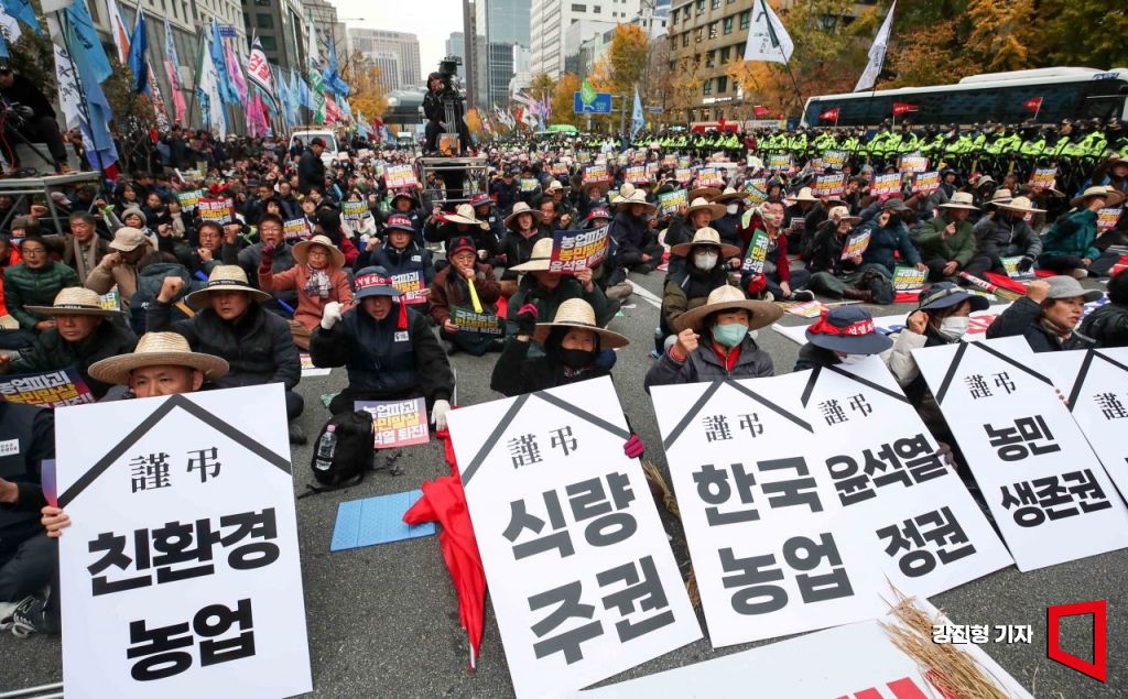 20일 서울 중구 숭례문 인근 세종대로에서 열린 '전국농민대회 및 윤석열 정권 퇴진 2차 총궐기'에서 민주노총 조합원 및 전국농민총연맹 소속 조합원들이 쌀 가격 안정 및 쌀 수입 반대 등을 촉구하고 있다.