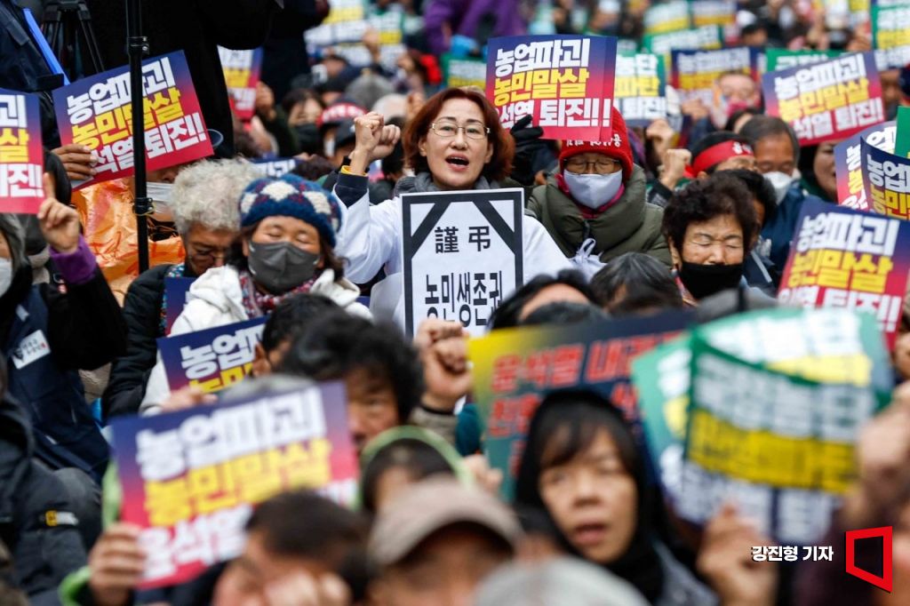 20일 서울 중구 숭례문 인근 세종대로에서 열린 '전국농민대회 및 윤석열 정권 퇴진 2차 총궐기'에서 민주노총 조합원 및 전국농민총연맹 소속 조합원들이 쌀 가격 안정 및 쌀 수입 반대 등을 촉구하고 있다.