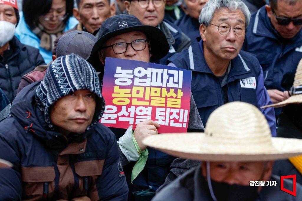 20일 서울 중구 숭례문 인근 세종대로에서 열린 '전국농민대회 및 윤석열 정권 퇴진 2차 총궐기'에서 민주노총 조합원 및 전국농민총연맹 소속 조합원들이 쌀 가격 안정 및 쌀 수입 반대 등을 촉구하고 있다.