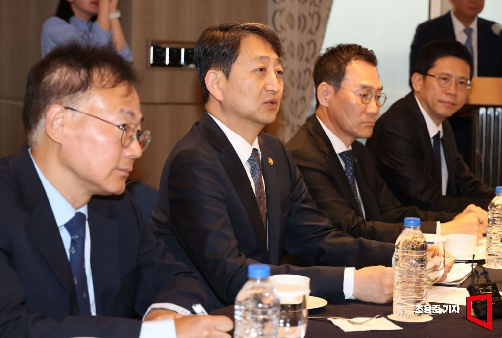 안덕근 산업통상자원부 장관이 20일 서울 중구 롯데호텔에서 열린 美 신정부 대비 조선업계 간담회에서 발언을 하고 있다. 이날 간담회에는 HJ중공업 유상철 대표, 삼성중공업 최성안 대표, 한화오션 김희철 대표 등 주요 기업 경영진이 참석했다.