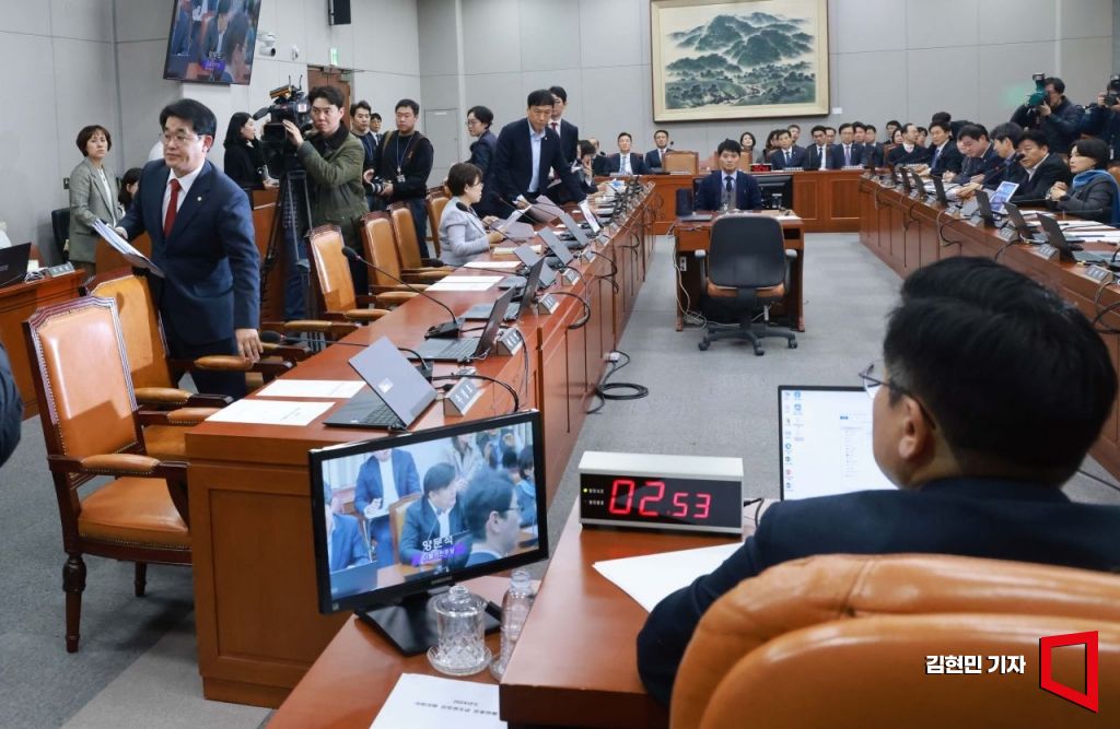 21일 국회에서 열린 운영위원회 전체회의에서 여당 의원들이 퇴장하고 있다. 이날 회의에서는 2025년도 국회, 국가인권위원회, 대통령비서실 및 국가안보실, 대통령경호처 소관 예산안을 처리했다.
