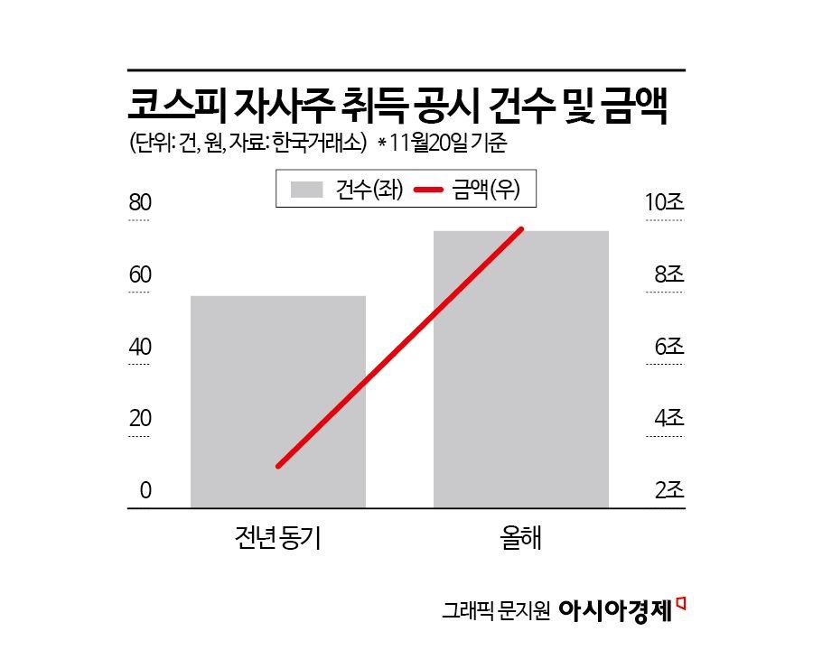 22일 한국거래소에 따르면 올해 유가증권시장 자사주 취득 공시건수는 20일 기준 77건을 기록해 지난해 같은 시기 59건에 비해 18건 증가했다. 자사주 취득 공시 기준 취득 금액은 9조7522억원으로 전년 동기 3조1685조원에 비해 세 배 이상 늘었다.