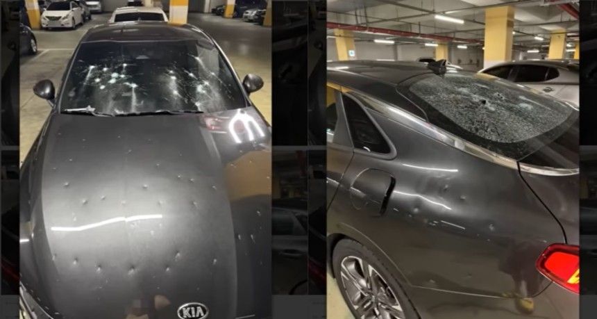 앞유리와 뒷유리가 파손되고 차량 곳곳이 멍키스패너로 찍힌 자국이 가득하다. 유튜브 채널 한문철TV 캡처