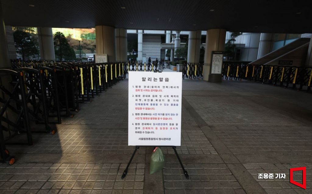 이재명 더불어민주당 대표의 위증교사 사건 1심 선고일인 25일 서울 서초구 서울중앙지방법원에 경내 시위 등과 관련한 안내문이 놓여 있다.