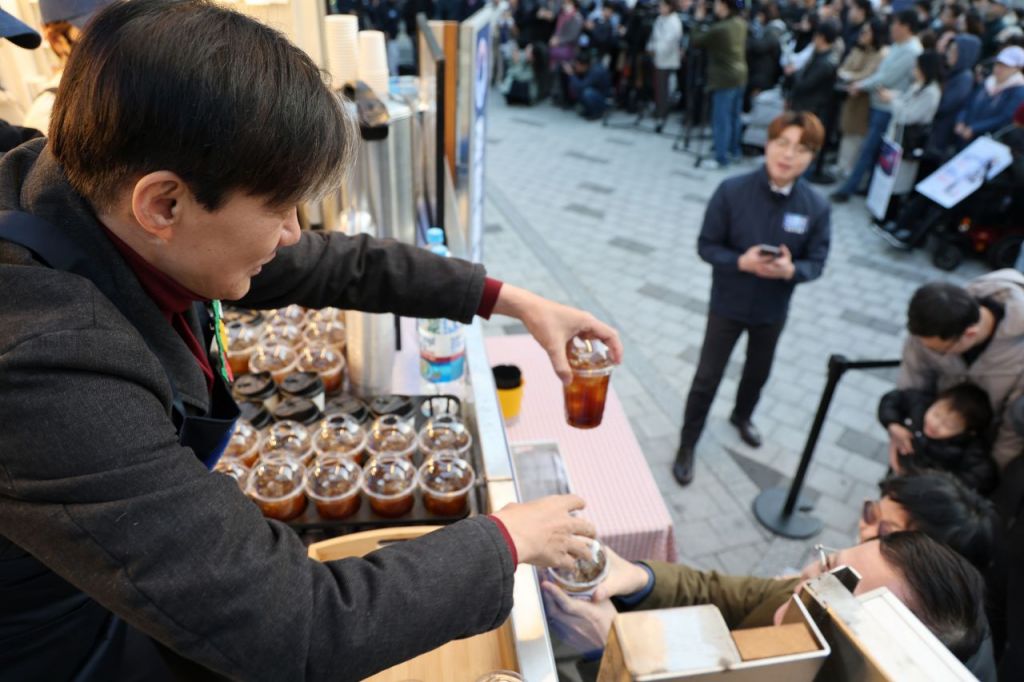 조국 조국혁신당 대표가 24일 대전 서구 대덕대로 인근에서 열린 '탄핵다방 5호점'에서 시민들에게 음료를 나눠주고 있다. 사진 = 조국혁신당 제공