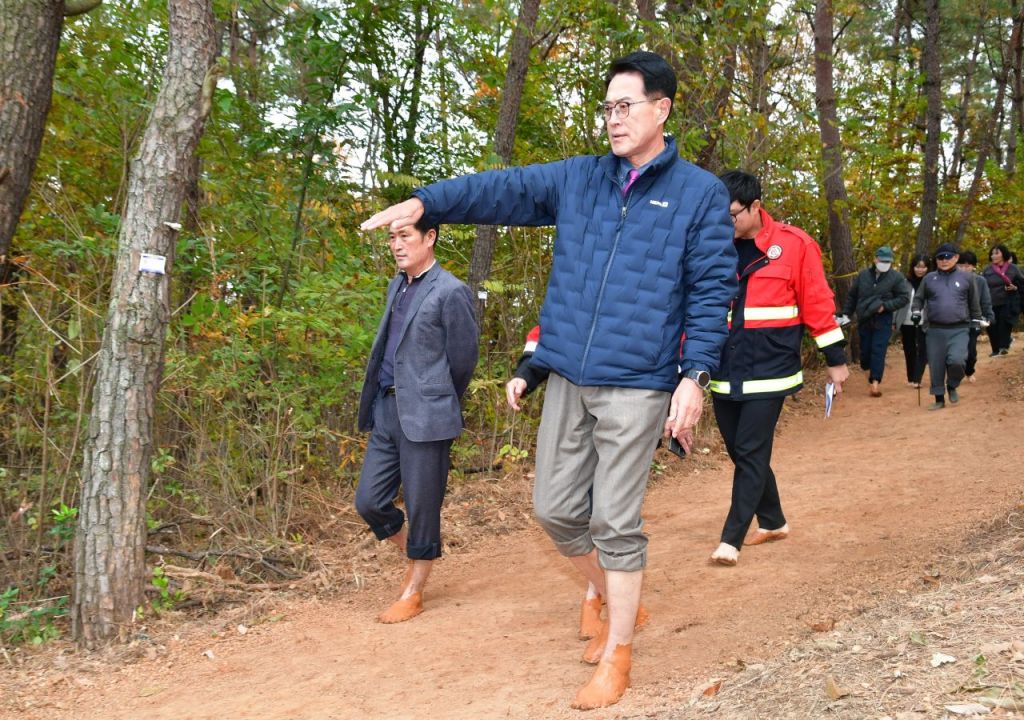 이순걸 군수와 참석자들이 맨발산책로 현장을 점검하고 있다.