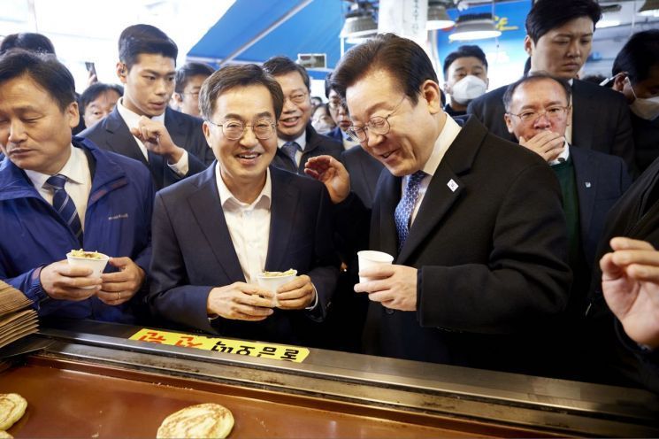 김동연 경기도지사(왼쪽)가 지난 21일 수원 전통시장을 찾은 이재명 더불어민주당 대표와 이야기를 나누며 웃고 있다.